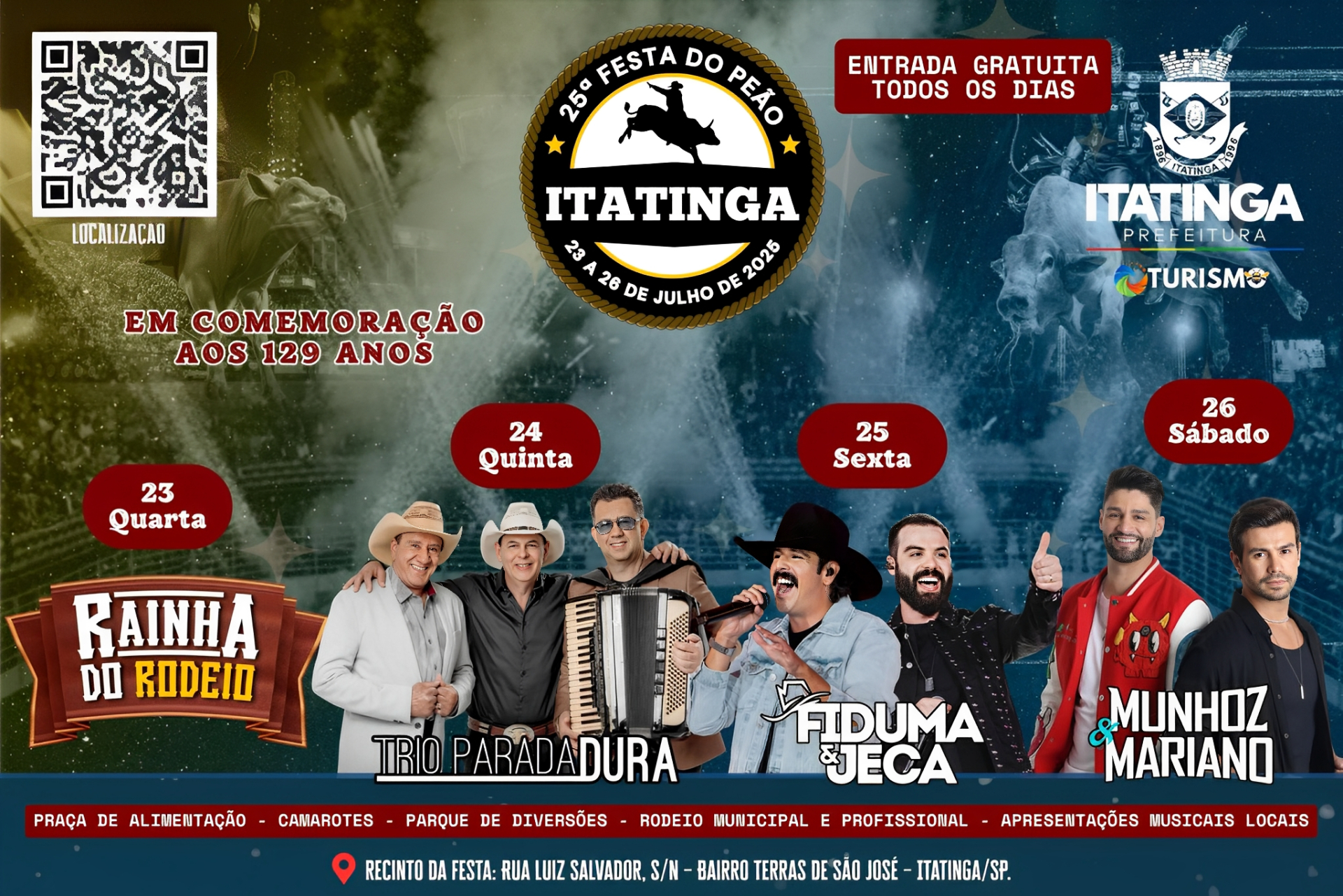 Itatinga já está em contagem regressiva para um dos eventos mais esperados do ano! Em comemoração aos 129 anos de emancipação político-administrativa, a cidade realiza a 25ª edição da Festa do Peão, entre os dias 23 e 26 de julho, com uma programação recheada de emoção, tradição e grandes nomes da música sertaneja. E o melhor: com entrada gratuita em todos os dias!